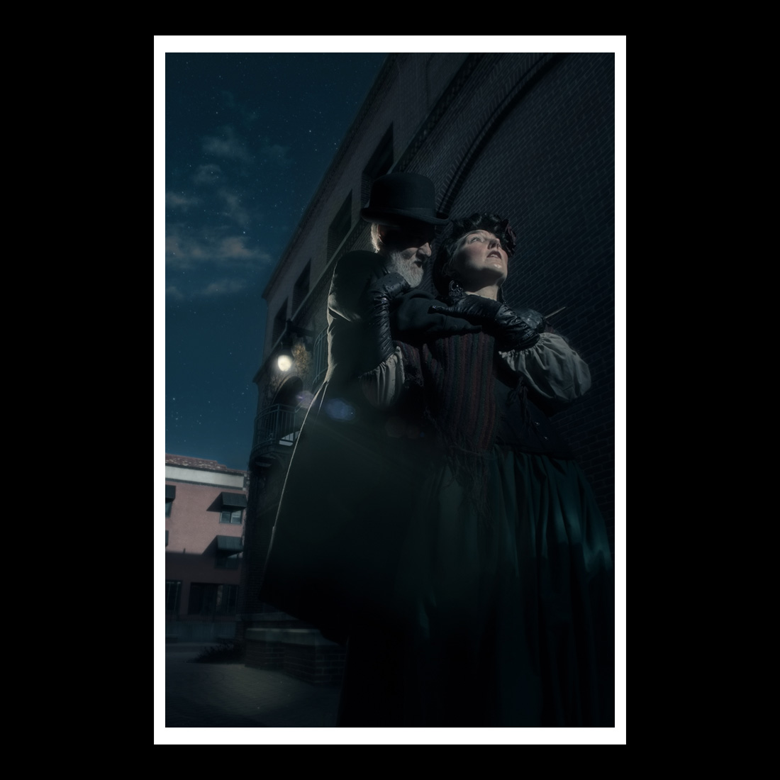 Keeper of the Night - AfterTo make things interesting, I wanted to create a scene as if it were straight of an old movie. What better story is there other than the infamous Jack the Ripper? That shot required a lot of coordination starting with scouting the right location that could pass as 1890s London. A parking garage next to a dance club in Oldtown, Wichita would have to do. I specifically wanted a lamp post in the shot so I could create some interesting backlight. After setting up the tripod, I had fired off a few shots before staging the actors when clouds were in the frame. I would use one of those frame to introduce clouds in the base shot when the clouds has long passed and was just a clean blue boring sky. I used a single speed light to light this entire shot. The actors were instructed to stay still as possible while I moved the strobe from the keylight position above to behind them - trying to align the backlight the best I could with the motivated light coming from the parking garage lamp post in the background. The final image was the result from multiple images and several masking techniques.